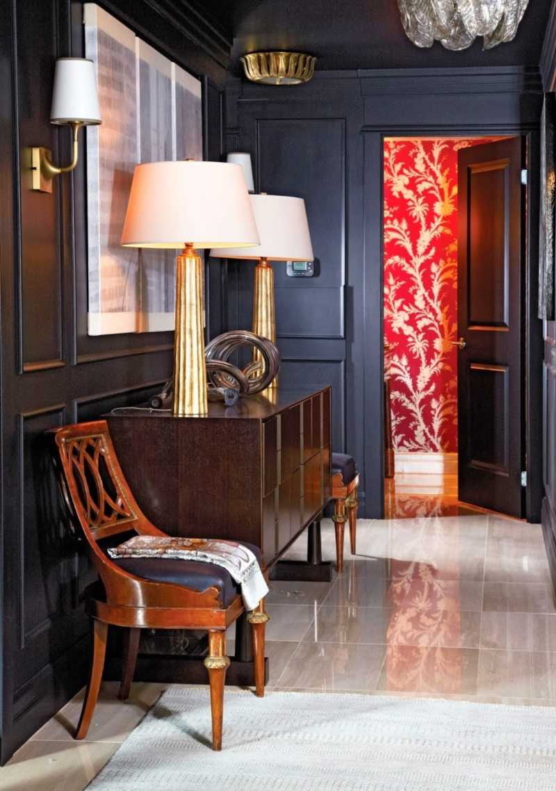 Чтобы сделать черную прихожую более стильной и роскошной, можно использовать в оформлении нотки золотистого цвета.