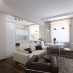 Цветовая гамма для стен предпочтительно, светлых тонов, а лучше всего в белом. На стену, которая относится к кухне, уместно поместить цветочное фото-панно. На светлых стенах приветствуются узоры, в черном цвете. На пол настилаем ламинат, отлично будет выглядеть имитация под белое дерево. Для экономии пространства, мебель желательно делать встроенную, касательно цвета, предпочтительны белые фасады. Благодаря светильникам с разной мощностью освещения, можно дополнительно разграничить зоны помещения.