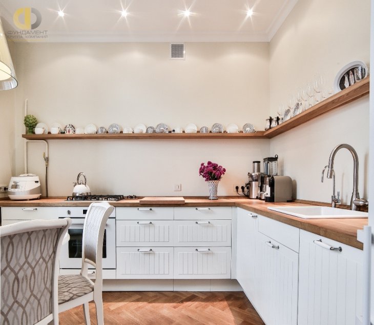 Экстравагантный дизайн с элегантностью и шармом в духе французской неоклассики, где сливаются традиции и современность. Светлые оттенки визуально расширяют пространство, это отличный вариант для квартиры на северной стороне дома в прохладном климате. Оттенки древесины и шоколада подчеркивают классический выбор. Желтый и бирюзовый цвет – эмоциональные акценты, как на фото.