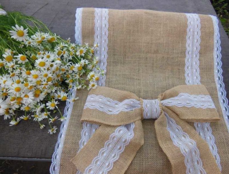 Из мешковины можно сшить красивые скатерти, которые способны украсить любой праздничный стол. Можно сшить скатерть, сочетая грубые волокна натурального материала с легким и нежным кружевом. Есть варианты скатертей с оборками, в которых используется мешковина разных оттенков.