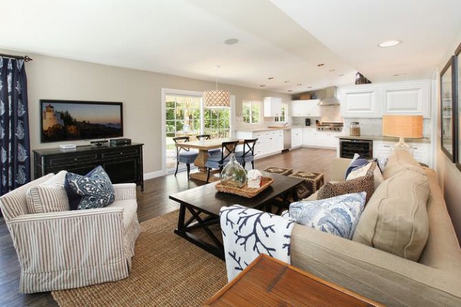 - Бежевый и белый интерьер домов, который сейчас на пике популярности, будет удачно сочетаться с окрашенной в любые оттенки мешковиной. Если вы человек творческий и эмоциональный, выбирайте яркие и броские цвета (малиновый, синий или желтый). Если вы спокойная и уравновешенная личность, то обратите внимание на небесно-голубой, светло-розовый или салатовый оттенок. Такие акценты создавайте на диванных подушках и шторах.