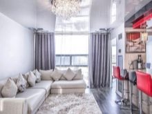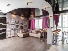 Если вы выбрали такое решение, включайте в интерьер мебель темных тонов при преобладании белого цвета на потолке, и наоборот, отдавайте предпочтение светлым предметам интерьера, если потолочная поверхность в комнате оформлена в темных тонах.