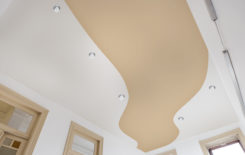 Двухцветные с успехом могут заменить конструкции из двух уровней. Они хорошо подходят для помещений с невысокими потолками. Цветовое разделение потолка выполняет функцию зонирования комнаты. Чтобы визуально удлинить помещение, используют цветные полосы, расположив их по продольной направляющей. Поперечные рисунки способны расширить пространство.
