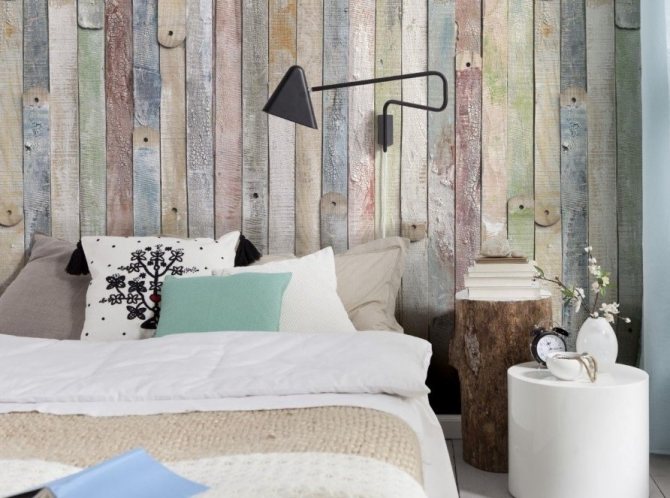 На фото пример дощатой поверхности стен в спальне