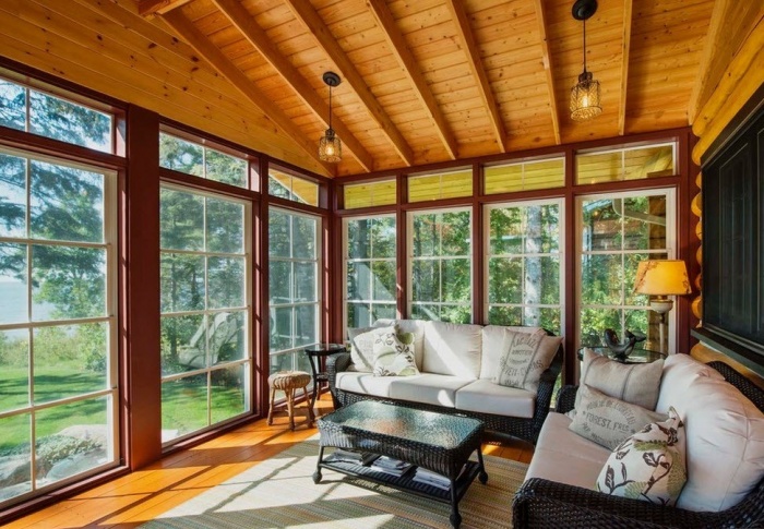 Все большую популярность набирает панорамное остекление. Открытая конструкция, которая устанавливается от стены до стены и от потолка до пола, позволяет впустить в дом максимальное количество естественного света. Помимо этого, данные варианты остекления зрительно увеличивают площадь комнаты и изменяют ее интерьер до неузнаваемости. Такое решение способно сделать современным любой дом.