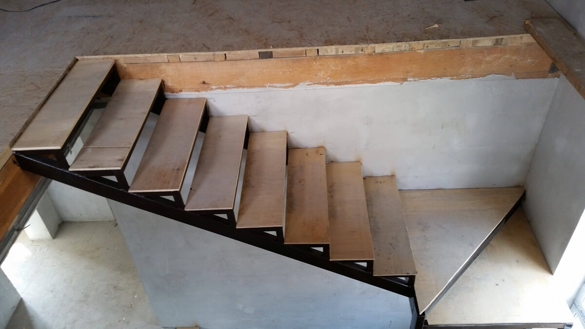 Согласно произведенным замерам, берется лист фанеры, выпиливается подложка, которую кладут под проступи. С помощью фанеры устраняется небольшой уклон металлического каркаса. После чего изготавливаются детали ступеней.
