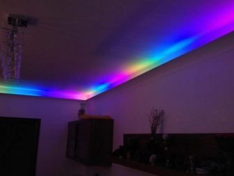 Подсветка на потолочных карнизах не является полноценным источником света, однако вносит изюминку в интерьер и может использоваться в ночное время. Существуют даже системы с пультом управления, позволяющие менять цвет лампочек по желанию.