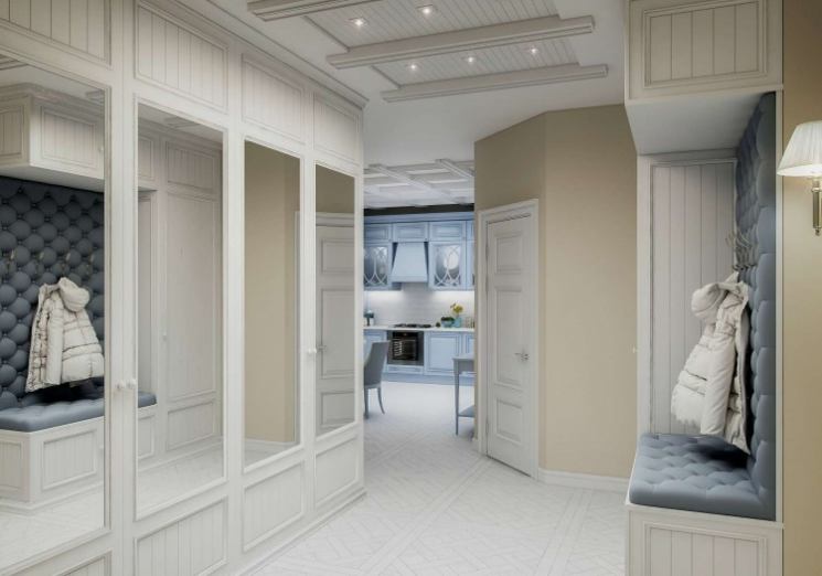 На фото белых интерьеров в журналах белизну подчеркивает какой-нибудь яркий плащ и стильная пара туфель. В реальности на вешалках и на полу одежды и обуви скапливается много, и она далеко не такая яркая. Контраст белого и серо-уличного необходимо приглушить. Сделать это можно несколькими способами: