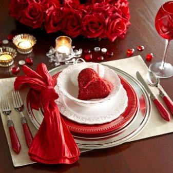 - Добавить романтики к оформлению стола помогут свечи, корзина с фруктами. Вместо фруктов в корзину можно уложить бутылку с вином. Приборы для ужина на двоих ставятся таким образом, чтобы сидящие оказались напротив. В данном случае не рекомендуется использовать много посуды – достаточно поставить по одному комплекту приборов. Скатерть может быть красной или белой. Придать большую нежность оформлению поможет сочетание красных и розовых тонов.