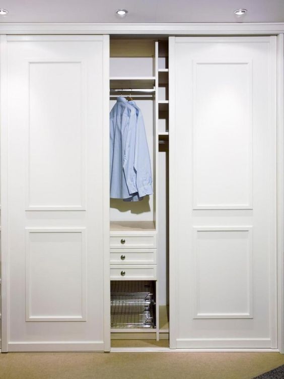 Часто декоративные элементы на дверцах становятся отсылкой к классическому стилю. Как мы уже упоминали, шкафы-купе и классика не самое топовое сочетание, но если вам непременно хочется их соединить, выход есть. Выбирайте белый цвет и филенки.