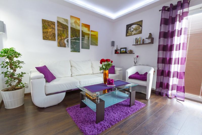 Изысканное сочетание сиреневого и белого цвета в интерьере гостиной