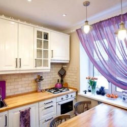 Выбирая шторы на кухню в таком стиле не стоит забывать, что все цвета должны быть светлыми. И сиреневый в шторах тоже.